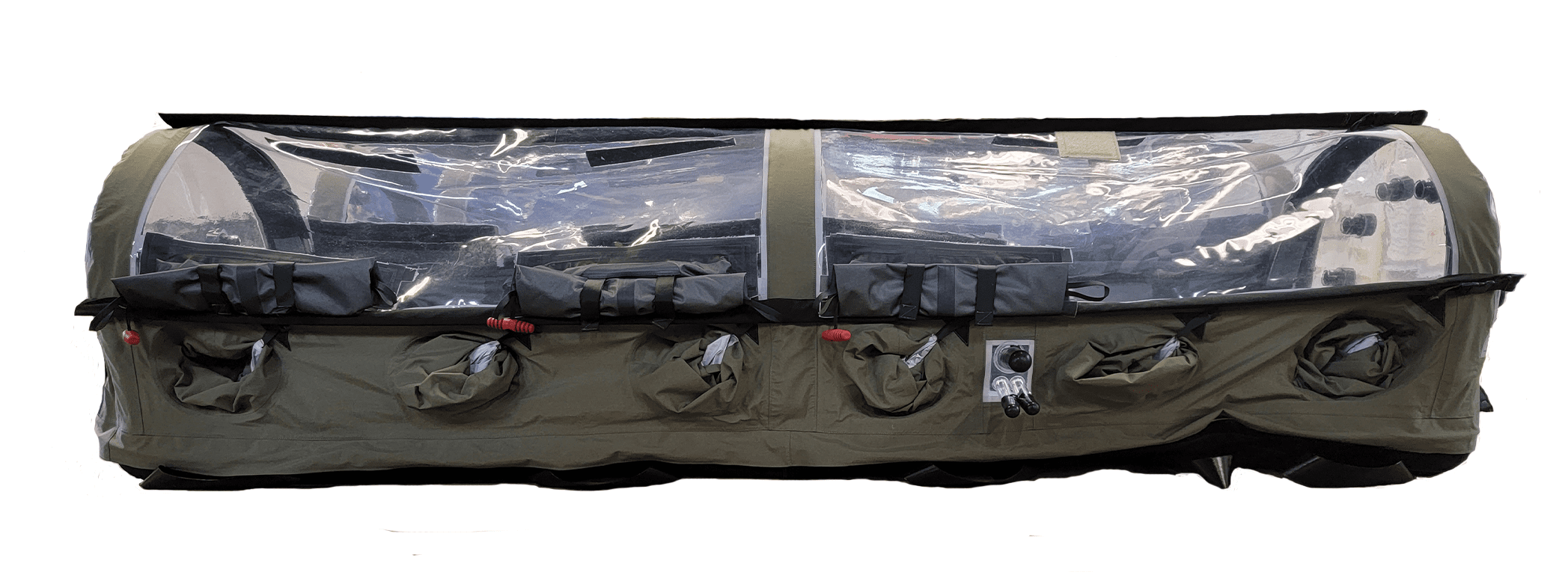 The C3L (Contaminated Casualty Containment Litter) Model C3L TP1_CAB is a highly versatile and portable Patient Isolation Unit (PIU) specifically engineered to provide a secure containment solution for patients exposed to chemical, biological, radiological, and nuclear (CBRN) threats. It is designed to effectively prevent cross-contamination of particulate matter, including a broad spectrum of toxic industrial chemicals (TICs), chemical warfare agents (CWAs), and biological hazards, thereby safeguarding healthcare personnel, responders, and the environment. During operation, the C3L maintains a controlled internal environment by creating a negative differential pressure, which ensures that any airborne contaminants are contained within the unit and do not escape into the external environment. This feature is critical for isolating infected or contaminated individuals while allowing for safe transport and treatment. Constructed with durable, chemical-resistant materials, the unit is lightweight and portable, enabling rapid deployment in diverse emergency scenarios. Its design also incorporates secure patient immobilization features and ports for medical access, facilitating ongoing care without compromising containment integrity. Overall, the C3L Model C3L TP1_CAB offers a reliable, effective solution for managing infectious or hazardous patients, ensuring maximum safety during transport and treatment in CBRN threat environments.